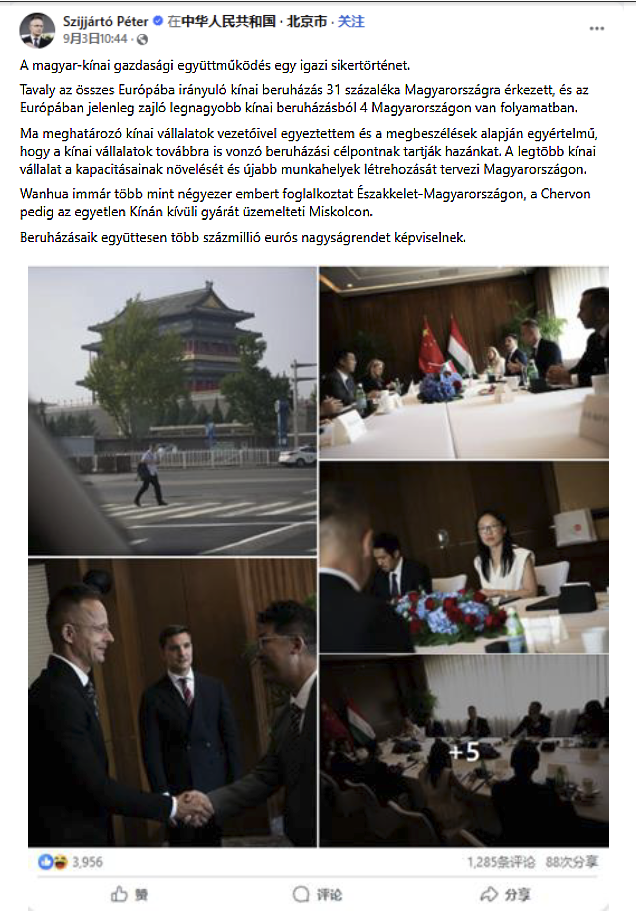 2025年9月3日,匈牙利外交與對(duì)外經(jīng)濟(jì)部長(zhǎng)西雅爾多在北京參加完紀(jì)念中國(guó)人民抗日戰(zhàn)爭(zhēng)暨世界反法西斯戰(zhàn)爭(zhēng)勝利80周年閱兵活動(dòng)后,同在匈牙利投資的中國(guó)主要公司領(lǐng)導(dǎo)人進(jìn)行了會(huì)談。